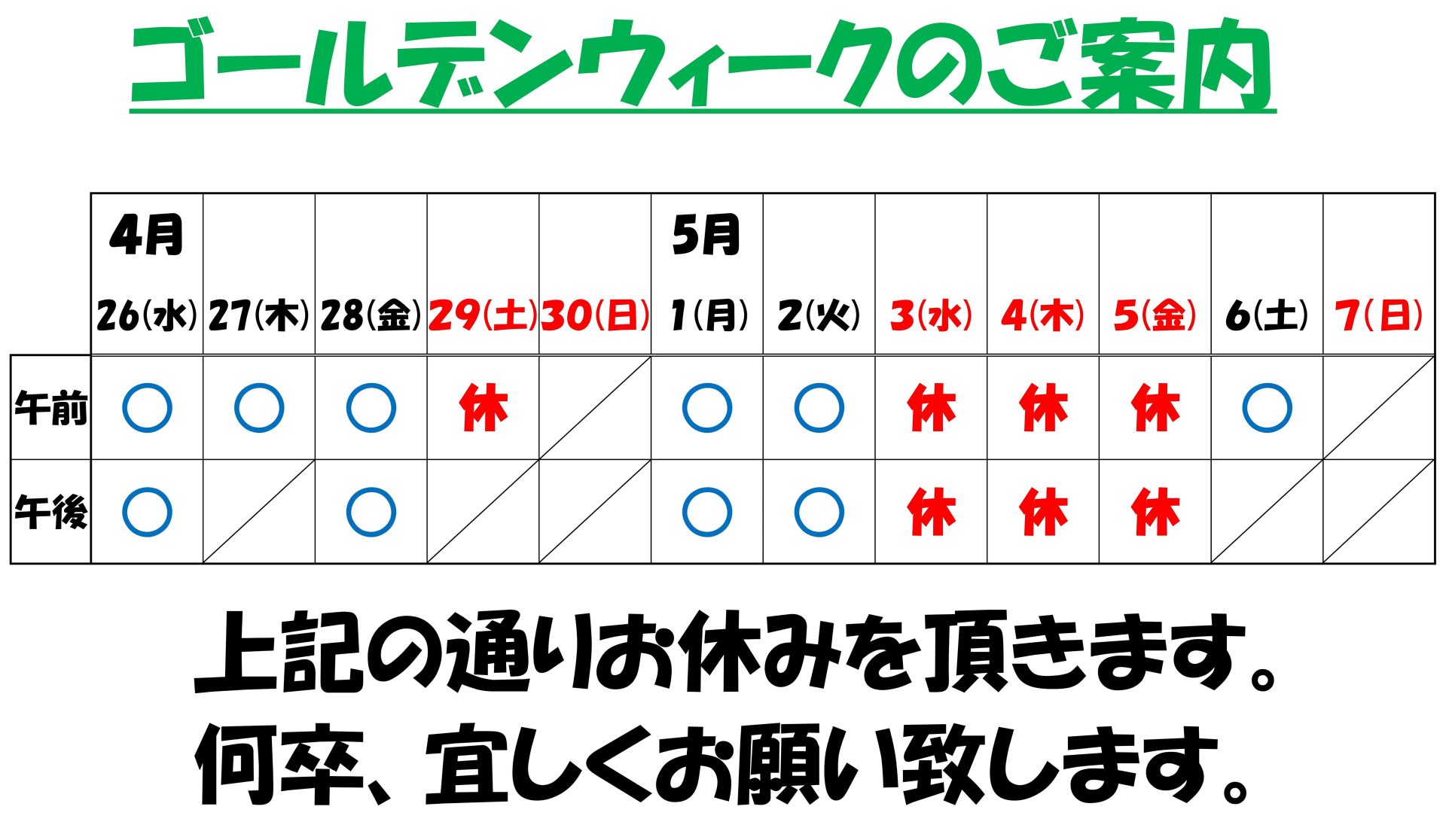 お知らせ news ホーム お知らせ 2023年 ゴールデンウィーク 休診のお知らせ 2023年 ゴールデンウィーク 休診のお知らせ 2023.04.05 一般・患者さん向け ゴールデンウィークの休診案内になります。 詳細については休診案内表をご確認下さい。 当院ご利用の患者様にはご迷惑をおかけしますが、何卒よろしくお願いいたします。 × 前の記事へ 一覧に戻る 次の記事へ